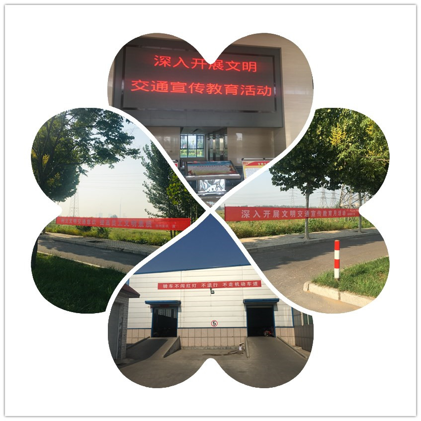 懸掛文明交通宣傳標語,營造濃厚的宣傳氛圍。公司在廠區(qū)門口對面及存車棚外等懸掛文明交通宣傳教育標語,使員工在上下班路上抬頭就可以看到醒目的標語,特別是在存車棚處時刻提醒員工“騎車不闖紅燈、不逆行、不走機動車道”。通過懸掛標語,營造了濃厚的文明交通宣傳教育氛圍。