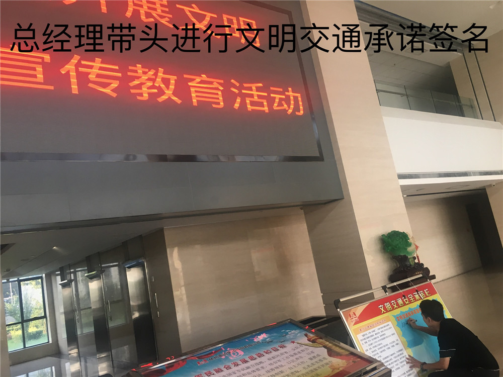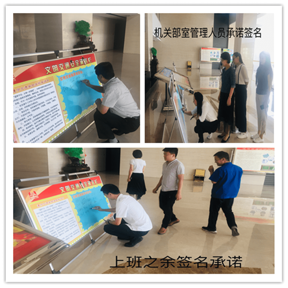 簽訂“遵守交通安全法規(guī)承諾書”。公司制作了“遵守交通安全法規(guī)承諾欄”版面十余塊,擺放在醒目位置,以部門為單位,每位員工在版面上進行簽名承諾。公司總經(jīng)理郭釧帶頭在《文明交通承諾欄》上簽名,其他領(lǐng)導(dǎo)和部門員工也陸續(xù)進行了簽名,通過交通安全承諾簽名,使每位員工時刻提醒自己,履行自己承諾。