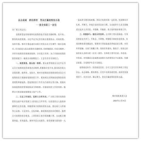 新年伊始,新型冠狀病毒疫情出現(xiàn)爆發(fā)之勢(shì)。疫情就是命令,防控就是責(zé)任。公司領(lǐng)導(dǎo)高度重視疫情發(fā)展趨勢(shì),于1月30日召開林州重機(jī)疫情防控緊急會(huì)議,著手安排公司疫情防控工作。